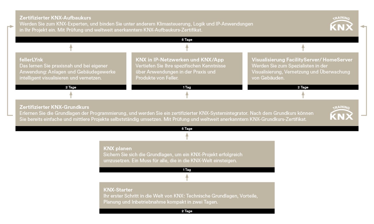 Als offizielle KNX-Ausbildungsstätte begleiten wir Sie durch Ihre gesamte KNX-Karriere, vom KNX-Einsteiger bis zum zertifizierten KNX-Aufbaukurs. Ihnen stehen verschiedene Ausbildungsmodule für Ihre persönliche Entwicklung zur Verfügung. Erkundigen Sie sich nach der für Sie optimalen Planung.