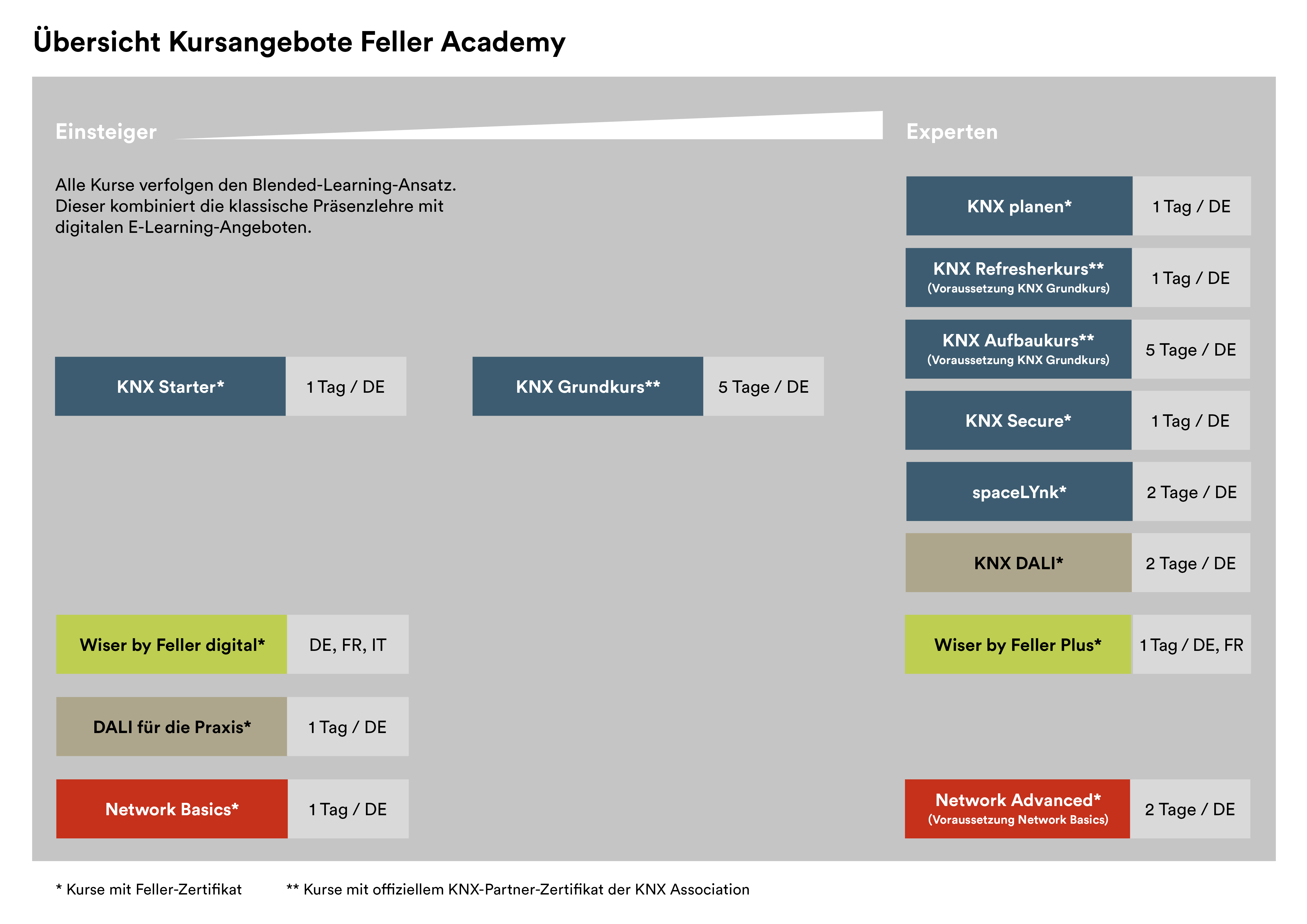 Sie eignen sich durch Feller Ausbildungen wertvolle Kenntnisse für die Praxis an: Von Connected Home über KNX-basierte Gebäudeautomation bis hin zu Heimnetzwerken stehen für Fachleute aus der Elektroindustrie und Gebäudeautomation professionell und praxisnah gestaltete Kurse zur Verfügung. Präsenz- und Onlineveranstaltungen werden dabei kombiniert angeboten. Dabei umfasst das Spektrum alle Bereiche von der Planung und der Installation bis zum Verkauf.