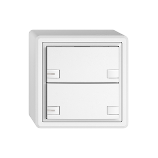 EDIZIO.liv • UNI-Taster • 12-48 V DC / 12-36 V AC • Schaltstrom min 1 mA, max. 50 mA • Max. 14 L • Mit Schraubklemmen • Mit LED Blau • Zweifach-Taste • 2-Tastenbedienung • SNAPFIX® Befestigungssystem • Anbauhöhe 59 mm • GX.54.A • weiss • IP20 • 74 x 74 mm